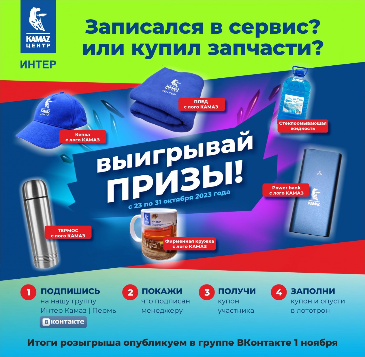 Все участники заполняли купоны и опускали в лототрон, с помощью которого 31 октября 2023 года мы и определили счастливых победителей. Имена победителей опубликованы в нашей официальной группе ВКонтакте https://vk.com/interkamaz_official.