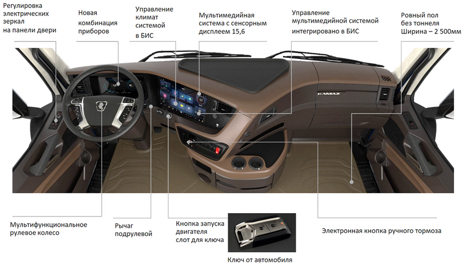 - Мультимедийная система с сенсорным дисплеем диагональю 15,6”, с функциями навигатора, радио, системами громкой связи, воспроизведения музыки, просмотра видео online или offline, контроля параметров автомобиля, управления отопителем кабины и предпусковым подогревателем