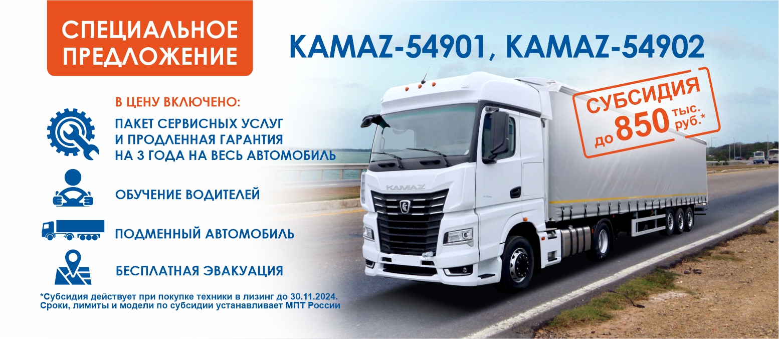 При покупке автомобиля KAMAZ-54901 или KAMAZ-54902 до 30.11.2024 действует специальное предложение, которое включает в себя: