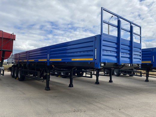 Бортовой, с фанерным настилом пола, внутренние размеры платформы, мм 13480х2476х730, V=24м3, кол-во осей/колес 3/6+1, односкатная ошиновка, полная масса 39т, г/п 32,06 т, под высоту ССУ тягача 1150мм, барабанные тормоза, оси ПЛАНТ, передняя подъемная ось, пневматическая подвеска, шины 385/65R22,5. |